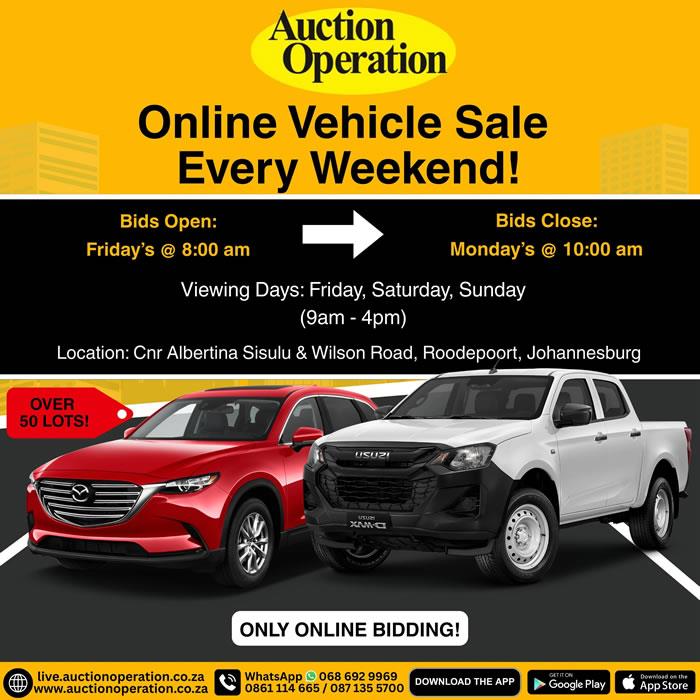 - Go to https://live.auctionoperation.co.za/ for online registration and bidding.