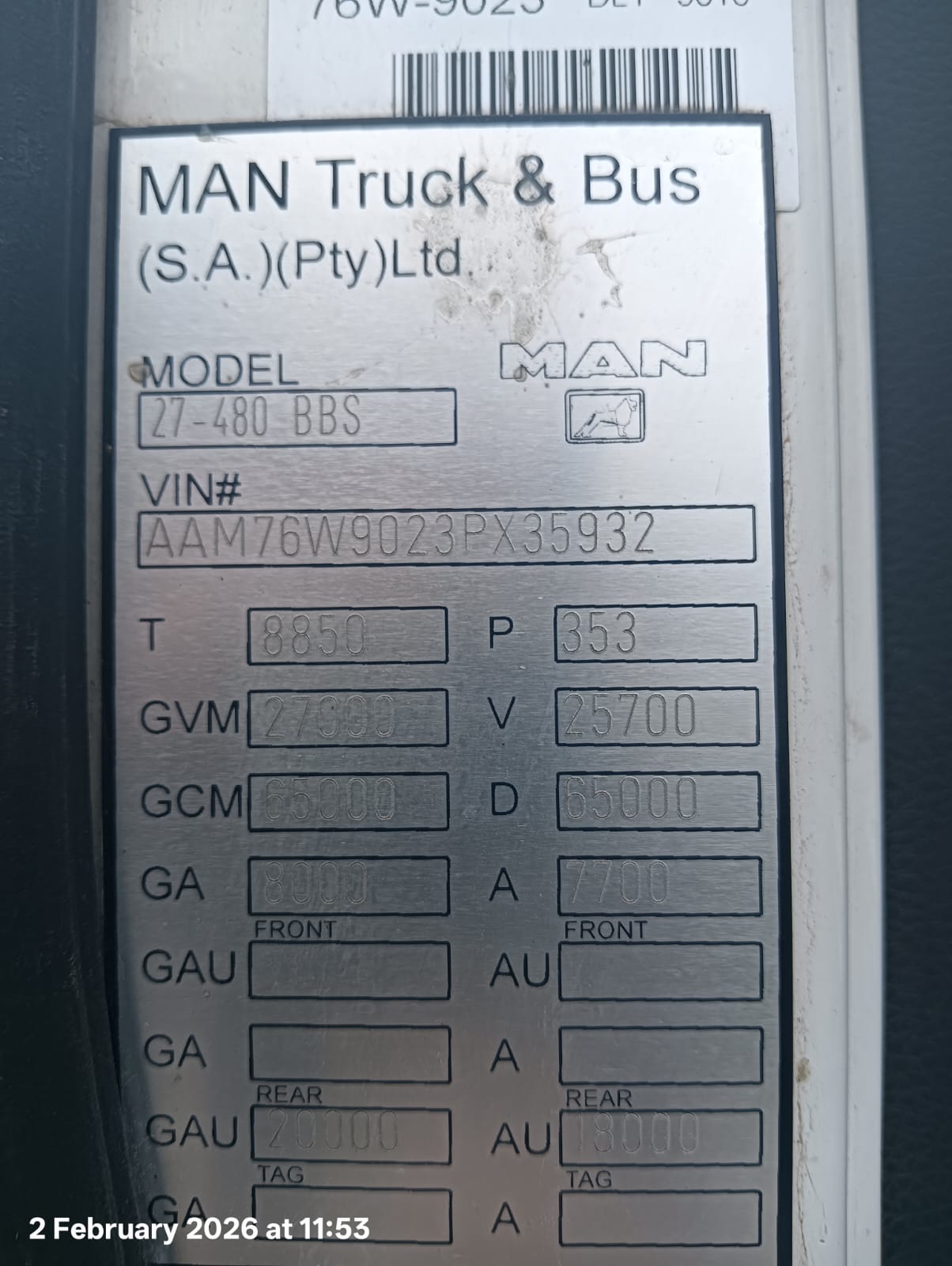 2017 FSY082L MAN T6S 27-440 (VIN #: AAM76W9023PX35932) (ODO: 0) (COLOUR: WHITE) (TRACK STREEPED PARTS MISSING/ONLY TWO WHEELS OTHER MISSING/BODY FULL OF DENTS/SCRATCHES/CRACKS/STONE CHIP.).